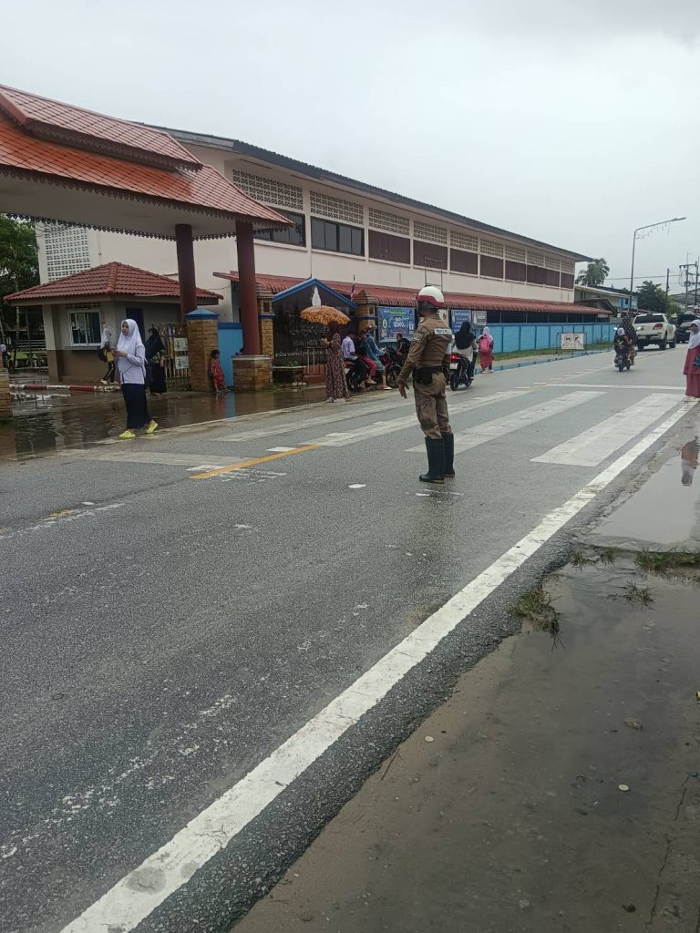 เจ้าหน้าที่ตำรวจจราจร อำนวยความสะดวกการจราจรหน้าโรงเรียนบ้านทอน